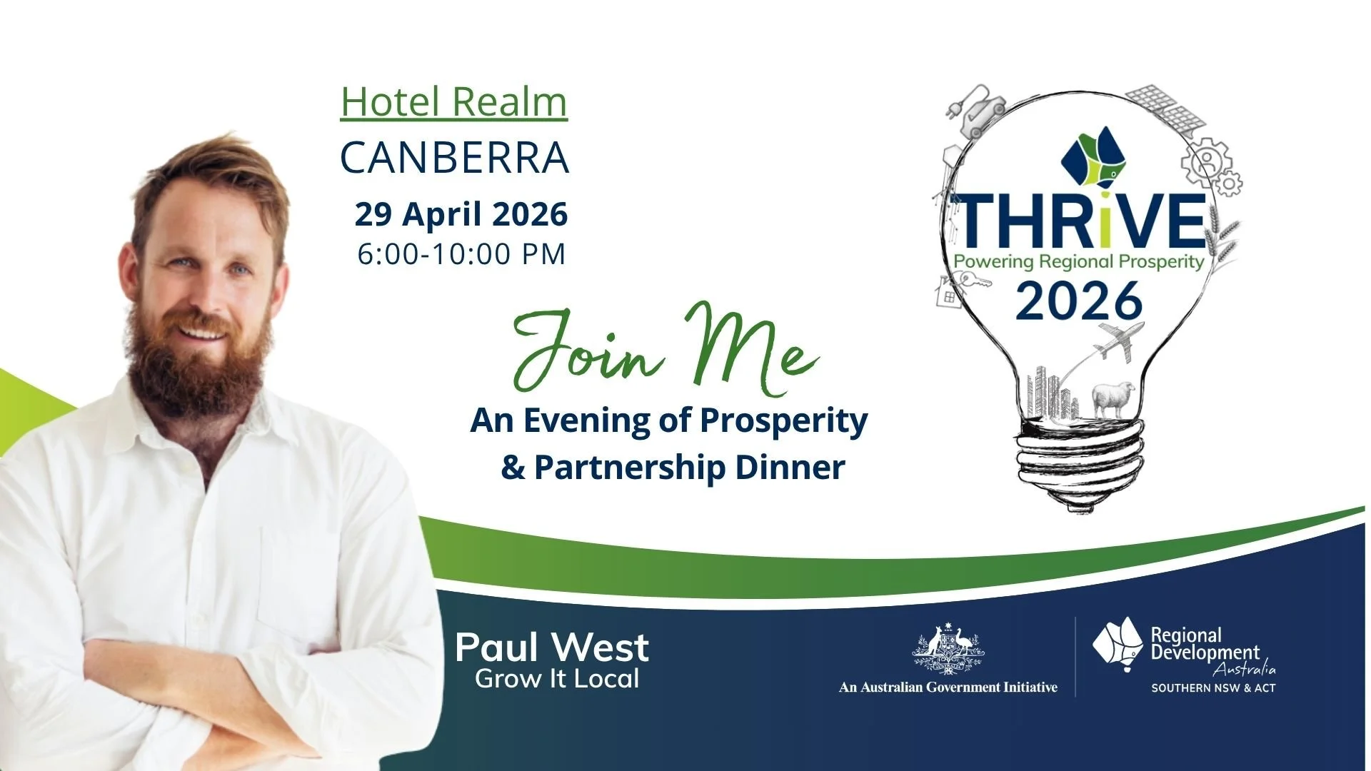 oin us for an evening dedicated to connection, collaboration and the shared ambition driving the THRIVE 2026 program. Featuring guest speaker, Paul West, a well-known regional personality, Co-founder of Grow It Local, broadcaster with the Australian Broadcasting Corporation, and host of River Cottage Australia and Back Roads. Paul brings a grounded and inspiring perspective on regional communities, sustainability and the strength of local economies.