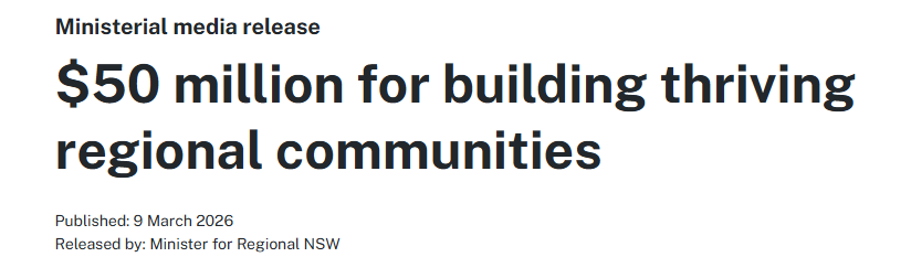 $25 million for Community Participation - Grants of up to $1 million to improve access to local activities and regional connection. For example, upgrading sports grounds to competition standard; expanding cultural and community facilities; safe transport and/or staffing to expand participation in group activity and engage across a region. Applications open on 23 March 2026.